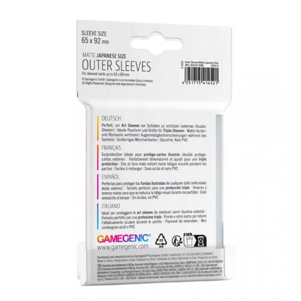 Protección adicional para tus cartas. Estas fundas Outer Sleeves de tamaño Japanese (65 x 92 mm) vienen en paquete de 60 unidades, con acabado mate antirreflejo que evita brillos y mantiene la legibilidad. Diseñadas por Gamegenic, ofrecen máxima resistencia, barajado cómodo y un ajuste perfecto sobre fundas interiores, prolongando la vida útil de tus cartas.