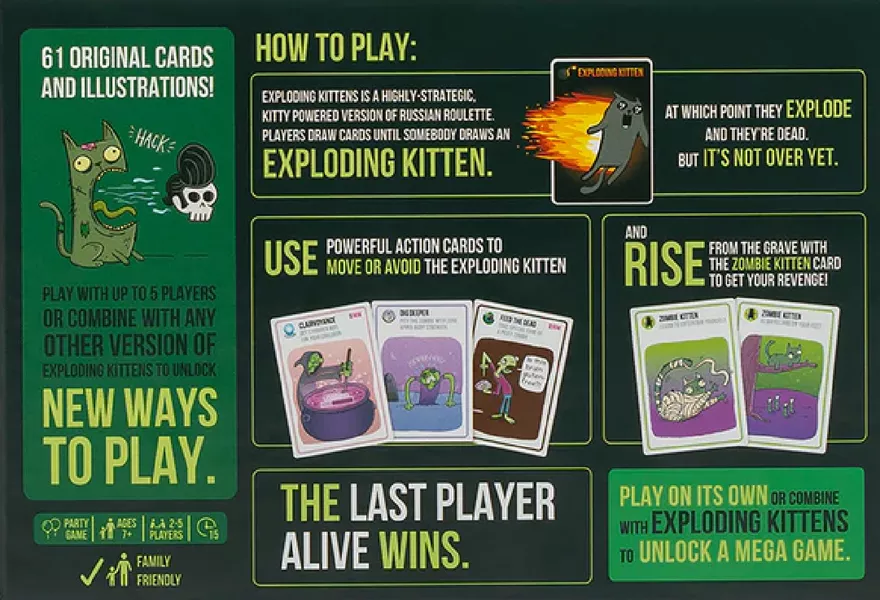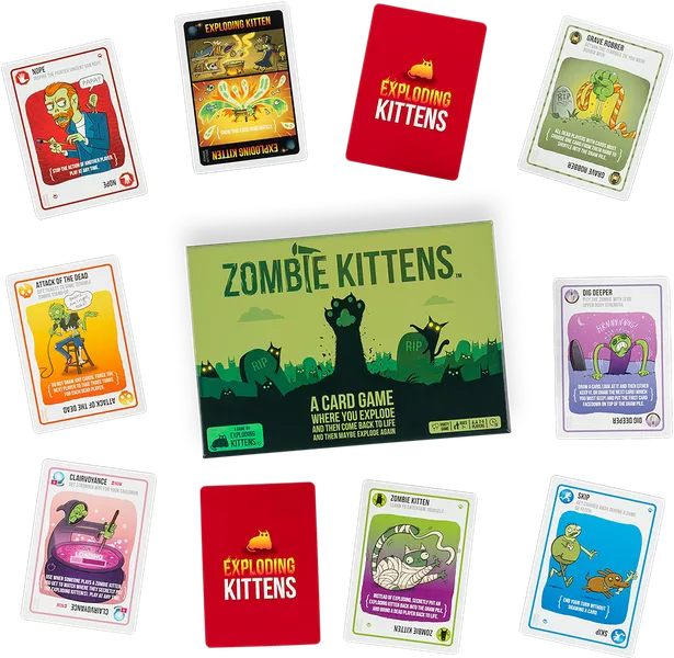 🧟⬛ Zombie Kittens es un juego de cartas caótico y divertido, donde los jugadores intentan evitar explotar… ¡pero esta vez pueden volver de la muerte! Con mecánicas rápidas, humor irreverente y giros inesperados, cada partida es una batalla de engaños y resurrecciones que mantiene la tensión hasta el final.